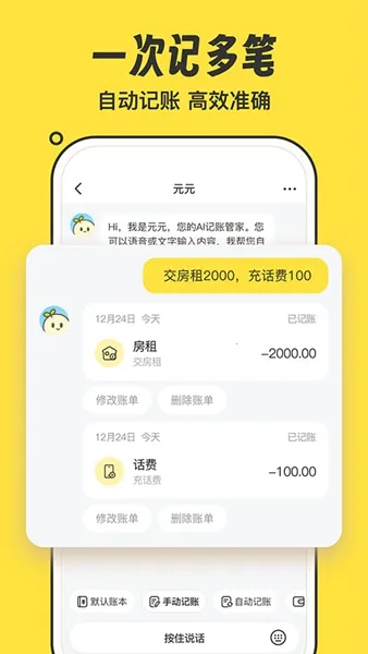 元元记账是手机记账软件,借助强大AI技术提供财务管理。支持语音、文字、手动记账,语音可录多笔消费自动生成账单并归类。还有资产管理、多账本等功能,满足多样记账需求,助您高效管理财务。
