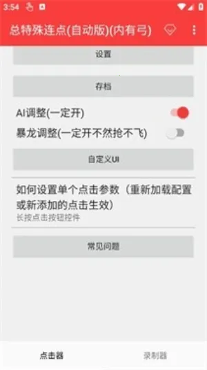 总特殊连点器是一款超棒的自动点击工具,专为游戏玩家等有高频操作需求的人设计。它功能强大,不仅能自动点击,还支持滑动、长按、多点触控等手势。能轻松录制操作步骤并自动回放,一秒点击一万次都不在话下,游戏挂机、演唱会抢票都好用。有可移动悬浮窗口,不切换界面就能调整点击参数。操作录制与循环执行功能超贴心,能记录一系列操作动作并自动重复,解放双手,减轻疲劳。支持点击频率和位置自定义,精准触发。还无需ROOT权限,多数安卓用户都能用。使用时,安装后打开同意进入,开启悬浮和使用权限,回首页点击启动就行,点击设置能调参数。添加脚本也简单,在录制器页面操作就行。有了它,各种重复操作都能轻松搞定,快来本站下载体验吧。
