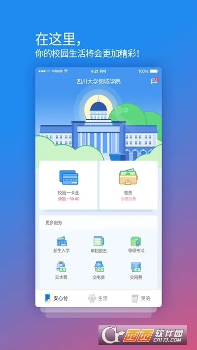 校园安心付是成都智汇安新科技有限公司开发的校园服务软件,能在线挂失充值饭卡、缴费,查看消费记录,支持多银行快捷支付,提供全方位校园支付服务,满足学子校园需求
