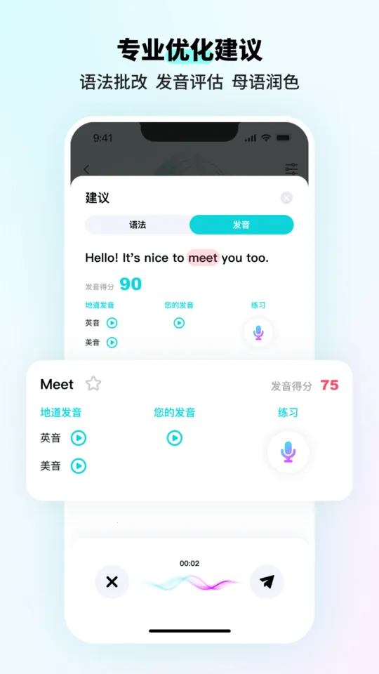 1. 发音精准:能精准识别各种方言口音,声纹级识别技术可检测音素级发音问题并纠正,中英文皆能完美识别。