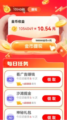 完成应用内广告任务可获金币奖励,积累到一定程度就能提现。