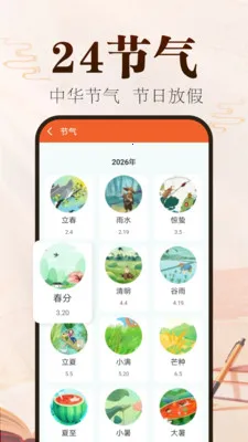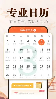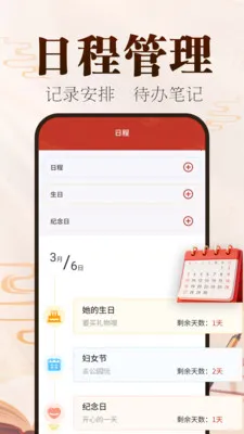 节日节气历史查询、日程记录以及天气动态等实用功能一应俱全,方便生活。