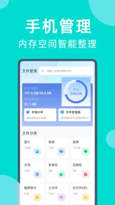 内置文件扫描功能,可快速准确扫描并分类展示手机文件,还能加密重要文件,压缩和解压文件也很方便。