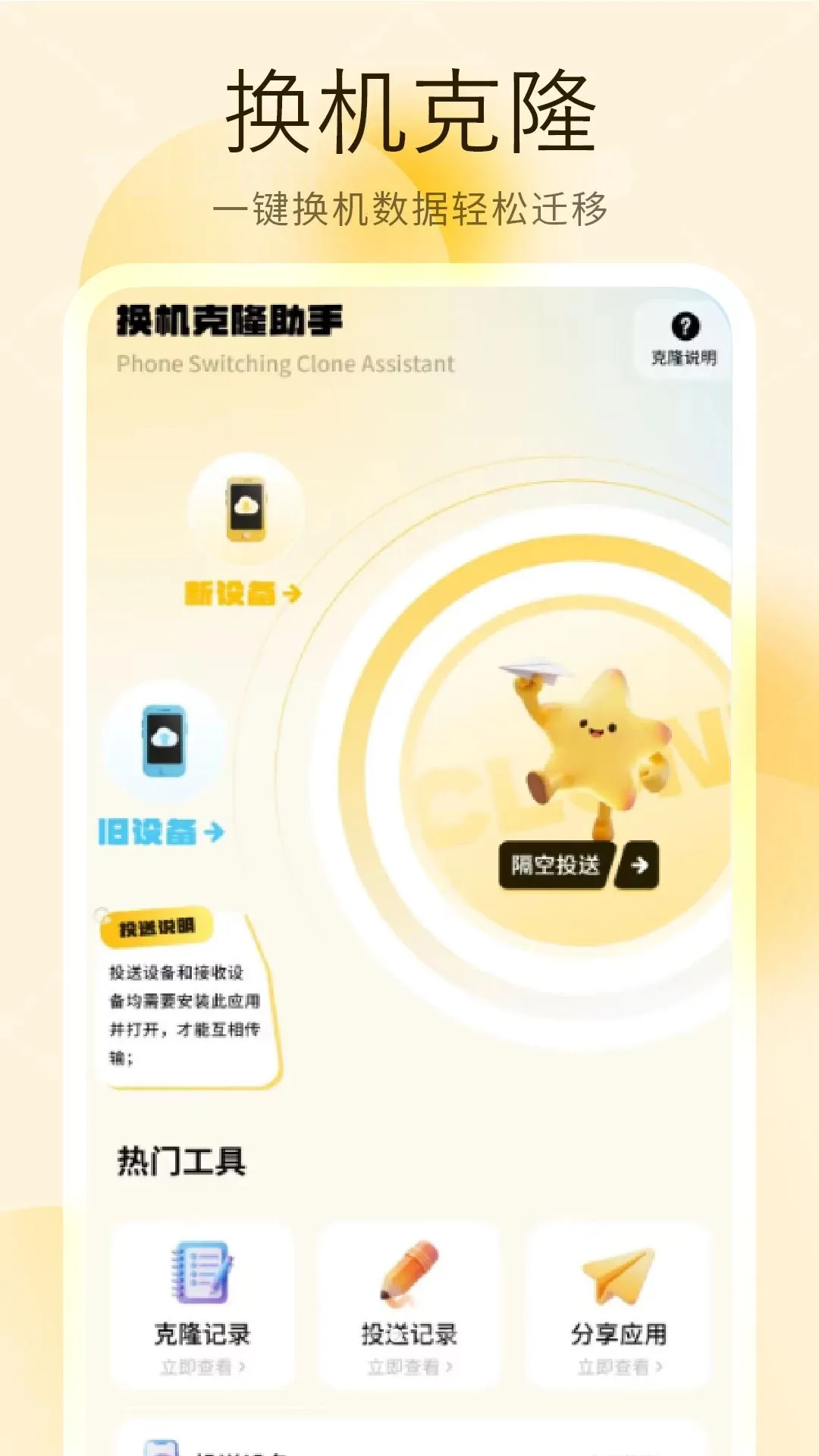 隔空投送无需网络,近距离无损快速分享文件,克隆服务提供清晰换机流程指引,克隆记录自动保存,传输状态一目了然。