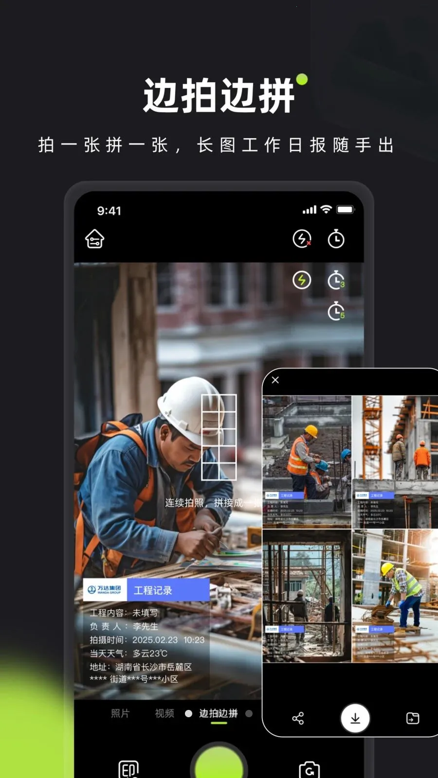 1. 支持实时添加时间、地点、经纬度、天气等水印,操作简单,一键拍摄快速保存,助力工作高效留痕。