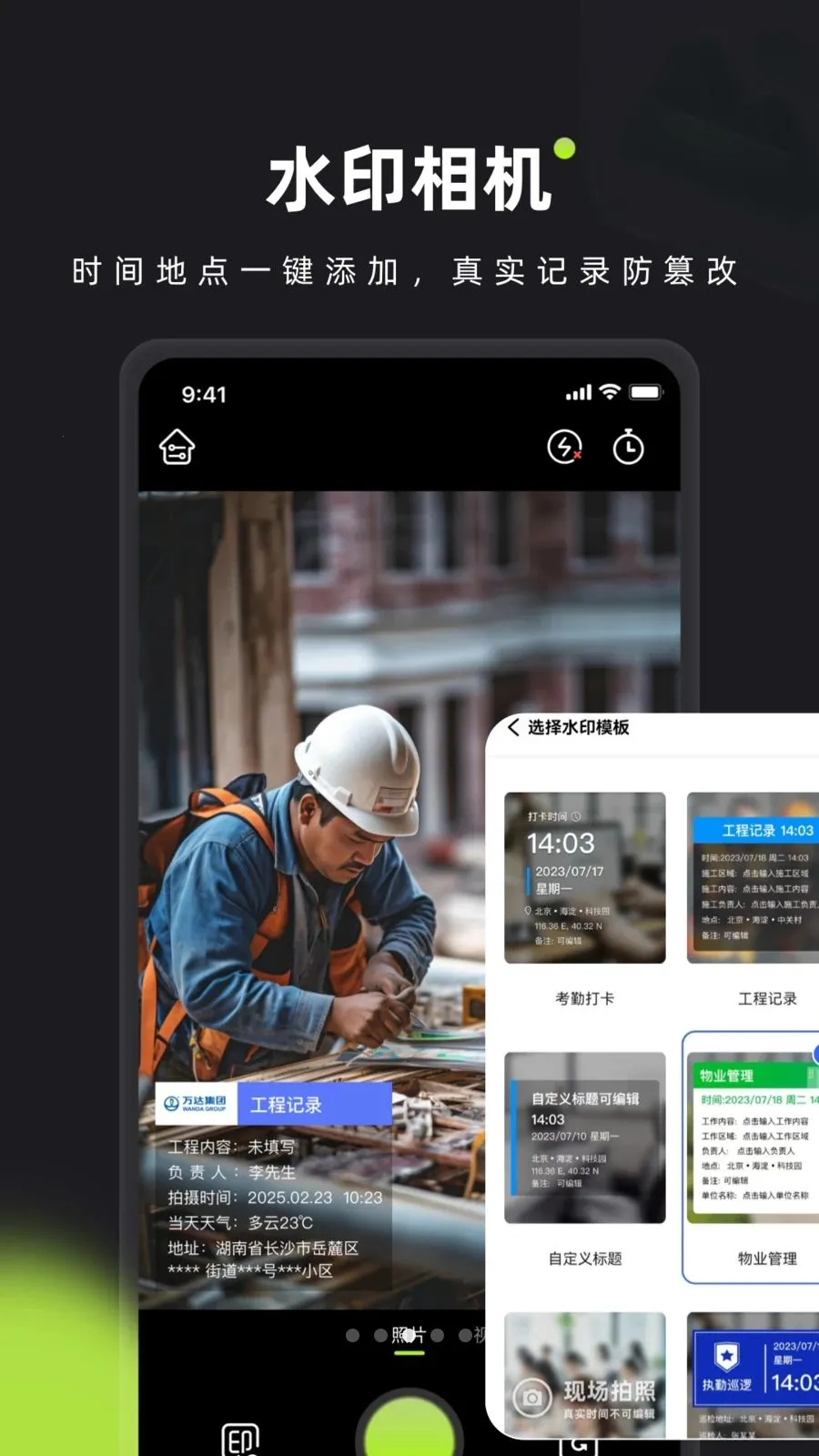 2. 多场景模板,内置工程施工、外勤巡检、考勤打卡、现场记录等专业水印模板,一键套用。