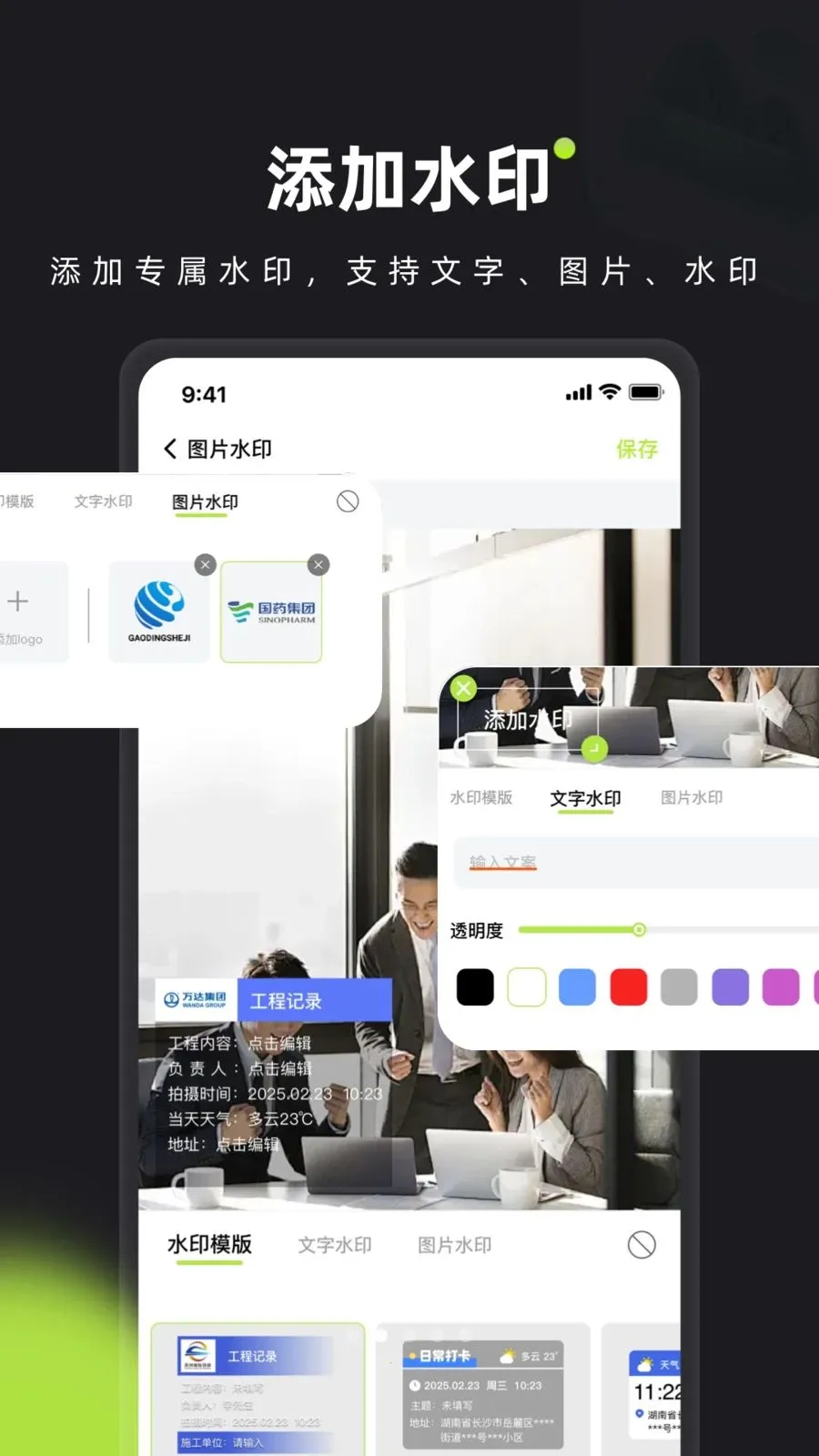 2. 内置工程施工、外勤巡检、考勤打卡等专业水印模板,一键套用,满足多种场景需求。