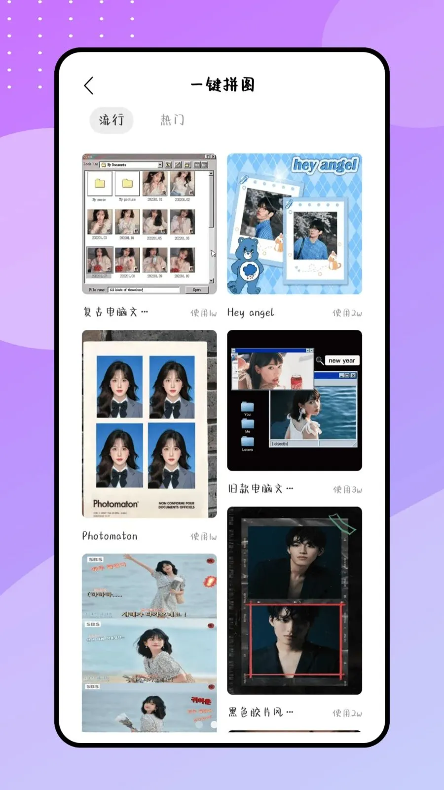 2. 海量热门拼图模板,复古胶片、韩系等风格一键套用,助力朋友圈氛围感排版。