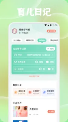 2. 能便捷记录宝宝辅食、睡眠、换尿布等日常细节,同步标记尿布状态与红屁屁情况。