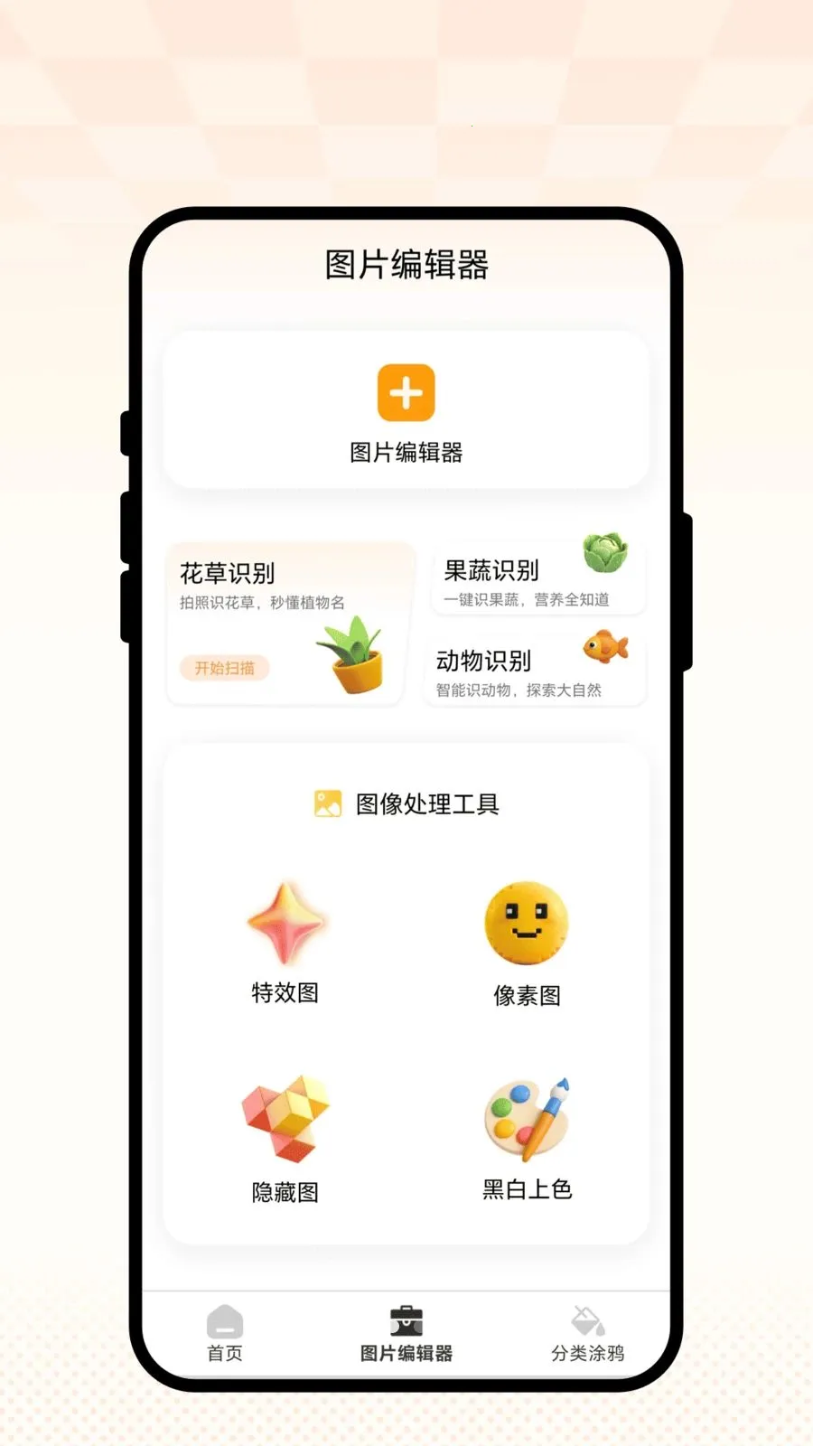 2. 支持特效生成、黑白上色、花草果蔬动物识别等多样操作。