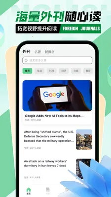 2. 海量外刊随心读,全品类覆盖且实时更新热点,能有效拓宽学习者的视野。