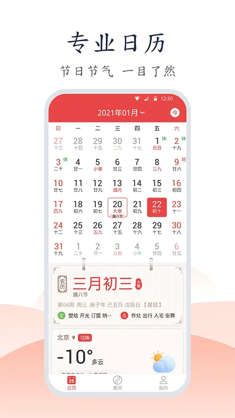 3. 界面简洁不冗余,凸显中国风,优质准确展现中国日历文化。