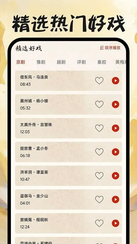 剧种分类详细,豫剧、京剧、秦剧等应有尽有,方便快速找到想听的戏曲。