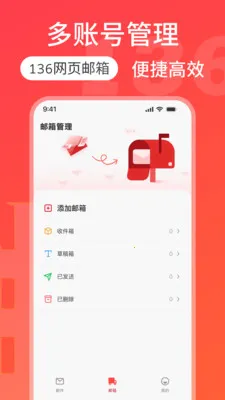 3. 邮箱管理井然有序,收件箱、草稿箱、已发送、已删除分类清晰,一键添加邮箱,整理有序。
