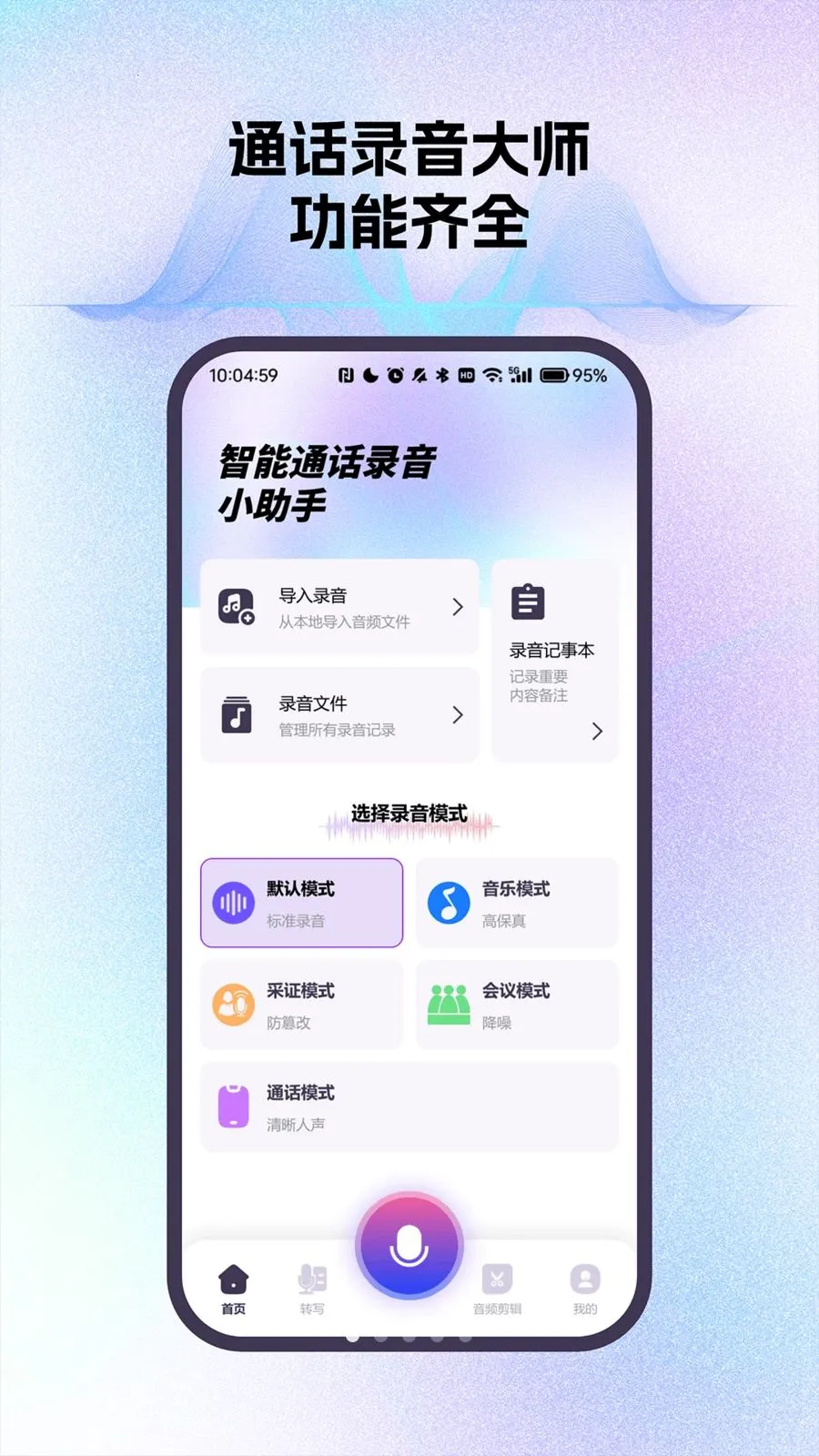 智能通话录音小助手能帮你轻松搞定各类通话及音频记录需求。它支持智能通话录音,还能从本地导入音频统一管理,录音文件按时间排,可加备注方便查找。多种录音模式超实用,默认、音乐、标准录音、高保真采证、防篡改会议、降噪通话、清晰人声等,适配不同场景。音乐模式适合创作者朗读录歌。录音记事本把语音和文字结合,文件列表展示详细信息。语音转写能自动把录音转文字,高效整理会议纪要或学习笔记。音频剪辑可裁剪音频片段,提取重点内容。不管是记录重要通话、整理会议内容,还是处理音频素材,它都能提供便捷辅助,首次发版就带来这么强大的功能,赶紧试试吧!