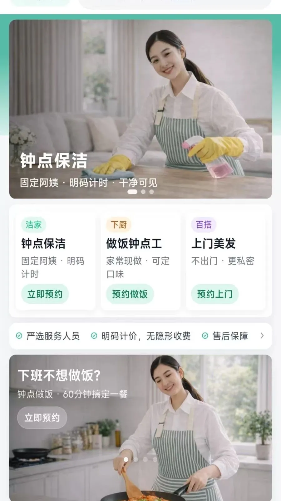 1. 提供多种上门服务,涵盖保洁、美发、做饭等,满足多样需求。