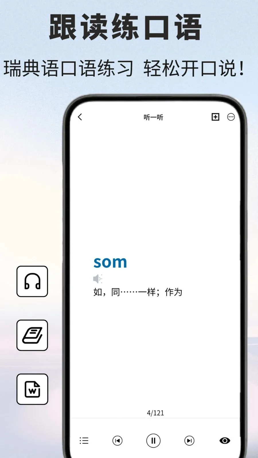 2、具备瑞典语学习功能,涵盖背单词、主题词汇、日常会话练习等。