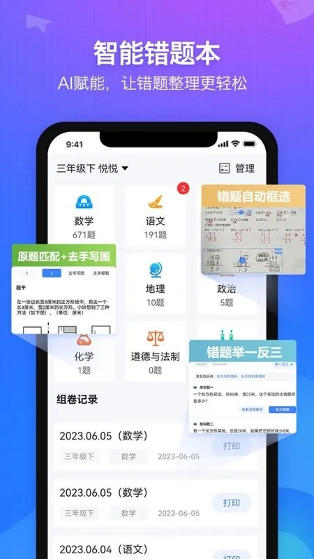 1. 智能错题整理便捷,拍摄卷面自动框题,还能智能去手写,方便复习。
