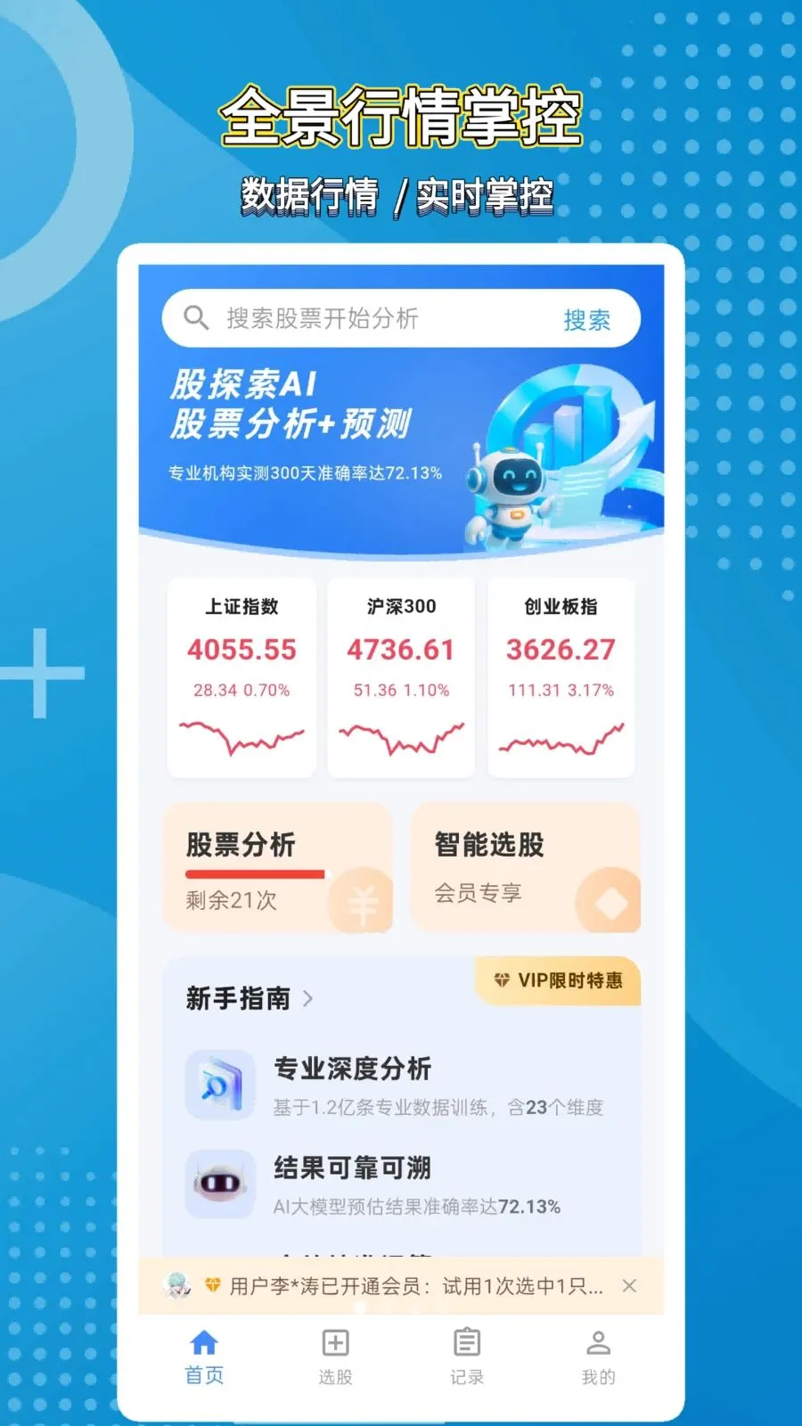 股探索AI是为普通投资者打造的一站式股票分析与行情监控工具。整合主流指数实时数据,支持智能条件选股、个股深度拆解,还有AI智能分析报告留存及分级自选监控等功能,现可实时查询股市信息。
