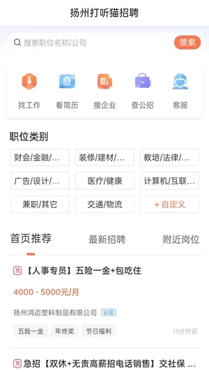 打听猫招聘app是专注本地化招聘的平台,为中小企业和蓝领岗位提供服务。有智能匹配、便捷发布等特色,具备完善简历、搜索岗位等亮点,还有实时通知等优势,支持多端同步,方便求职招聘。