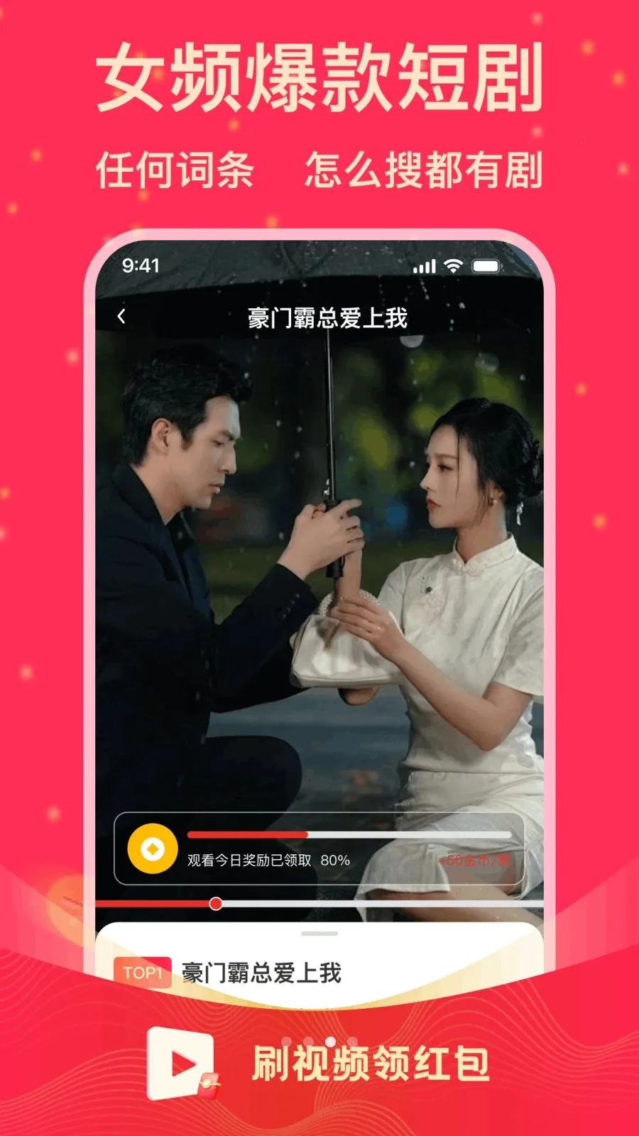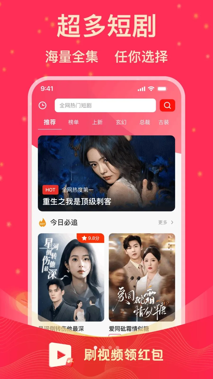 刷短剧领红包2026是追剧福利好帮手,汇聚全网爆款短剧,分类全题材丰富。看剧做任务领红包可金币兑换并提现;有实时排行榜,精选高分剧,告别剧荒,还有新版本发布。