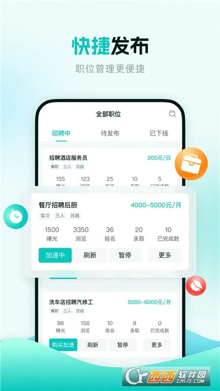 2. 职位快捷发布且管理方便,可轻松搞定招聘需求,在线聊工作,入职招人更高效,获取对方联系方式更快捷。