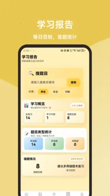 3、提供搜索与题目筛选,快速定位所需内容,配合学习报告与打卡工具。