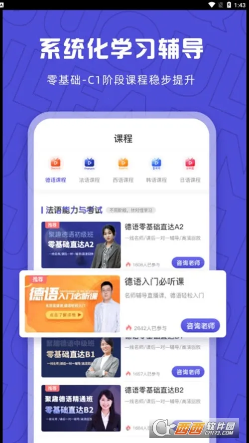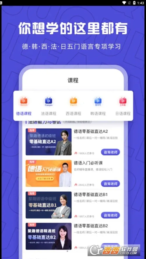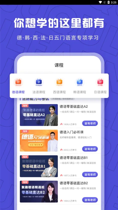 4. 随时随地能学,手机平板均可,海量录制课程及直播教学,是小语种学习得力帮手。