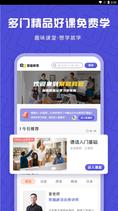 聚趣网校是一款超棒的线上教育学习软件!它集合了德语、法语、韩语、日语、西班牙语教学。不管你是出于职场需求、兴趣爱好还是留学打算,它都能满足。