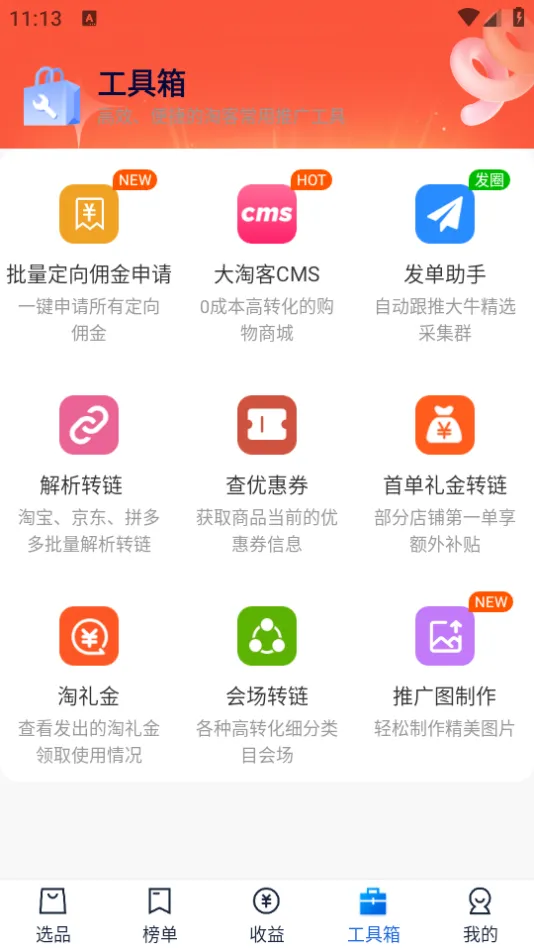 3、商品丰富:汇聚10万来自淘宝的高返佣超值商品,提供优质选品库。