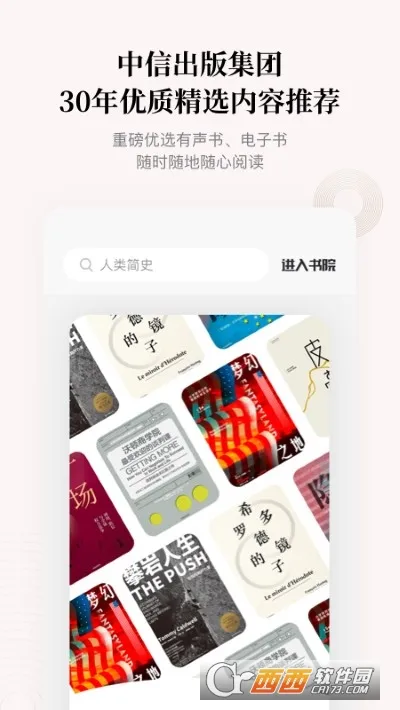 中信书院是中信出版集团打造的在线阅读软件,合理利用碎片化时间。有超2000本电子书、百本有声书,提供书摘点读、好书伴读等服务,还有知识专题、精品课程等助力知识进阶 。