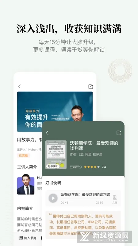 3、功能多样:包含有声书、电子书、好书快听、视频读书、精品课程、知识专题等,可助用户建立知识体系、快速提升。