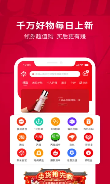 2、优惠福利多,有大量淘宝天猫内部大额优惠券,还有9.9包邮专场、每日半价、限时抢购等活动,帮用户省钱。