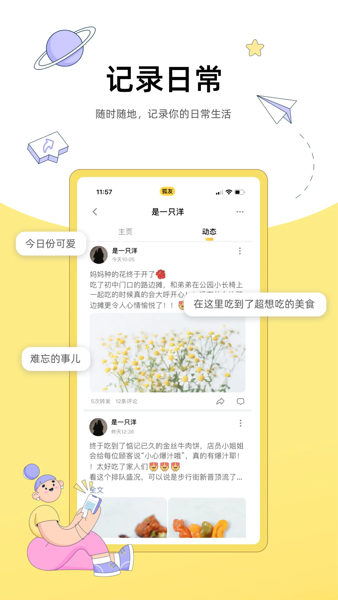 狐友 2025 最新版本是搜狐打造的兴趣交友社区。能精准匹配校友及同好,有海量动态可围观分享,支持一键转发。特色有兴趣推荐、大咖直播等,功能丰富,致力于打造健康有趣社交平台 。