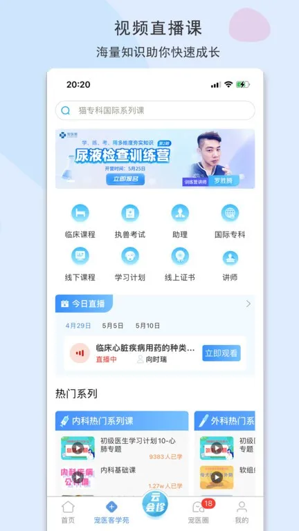 4、助力职业发展:提供执业兽医培训课程、病例临床操作技巧视频,还有5大医生成长阶段晋升学习、10大专科系统课程清单等,帮助宠物医生提升技能。