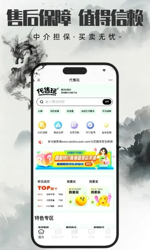 代售玩app是游戏账号交易平台,24小时服务。交易流程简单、到账快,安全保障严格。支持多类游戏,免服务费,有平台担保、人工验证换绑等,界面操作方便,售后专业。