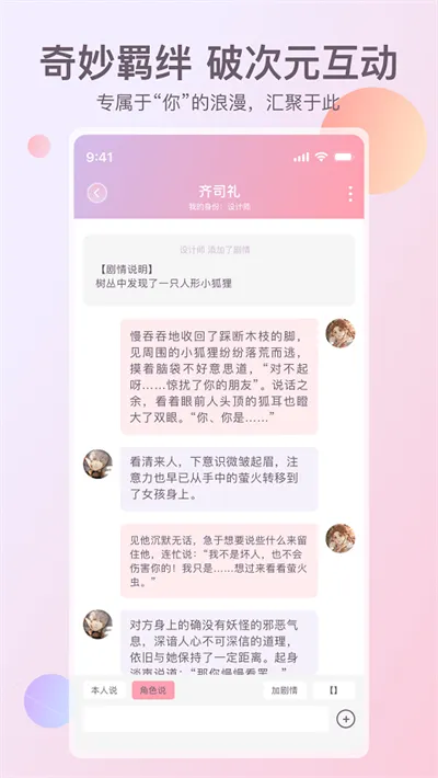 2、角色扮演自由度高,提供海量热门角色和剧组供用户选择,能自由选择心仪身份,通过角色卡建立人物档案提升互动体验。