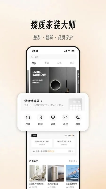 4、能实现品质守护,助力用户轻松整装新家,还支持一键采购家装产品。