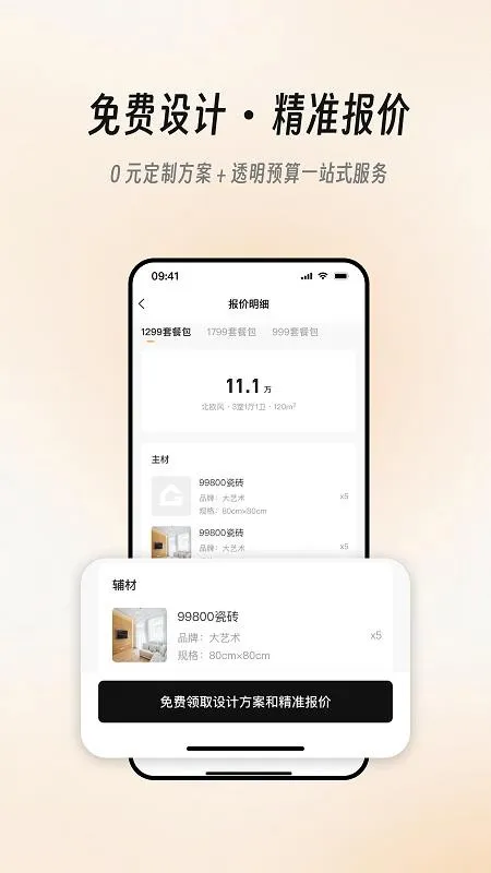 3、支持免费设计新家,输入房屋信息即可获取精准报价,合理设定装修预算。