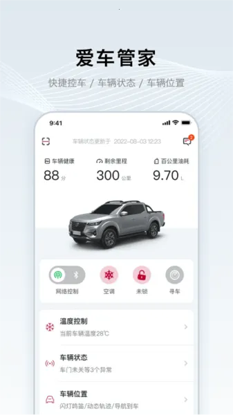 4、可远程开启关闭空调并设置温度,出行更舒适。众多车主反馈,该软件实用性强,极大提升了驾驶体验,满足了日常对车辆状态监控等需求,带来了智能化科技服务和个性化出行体验。