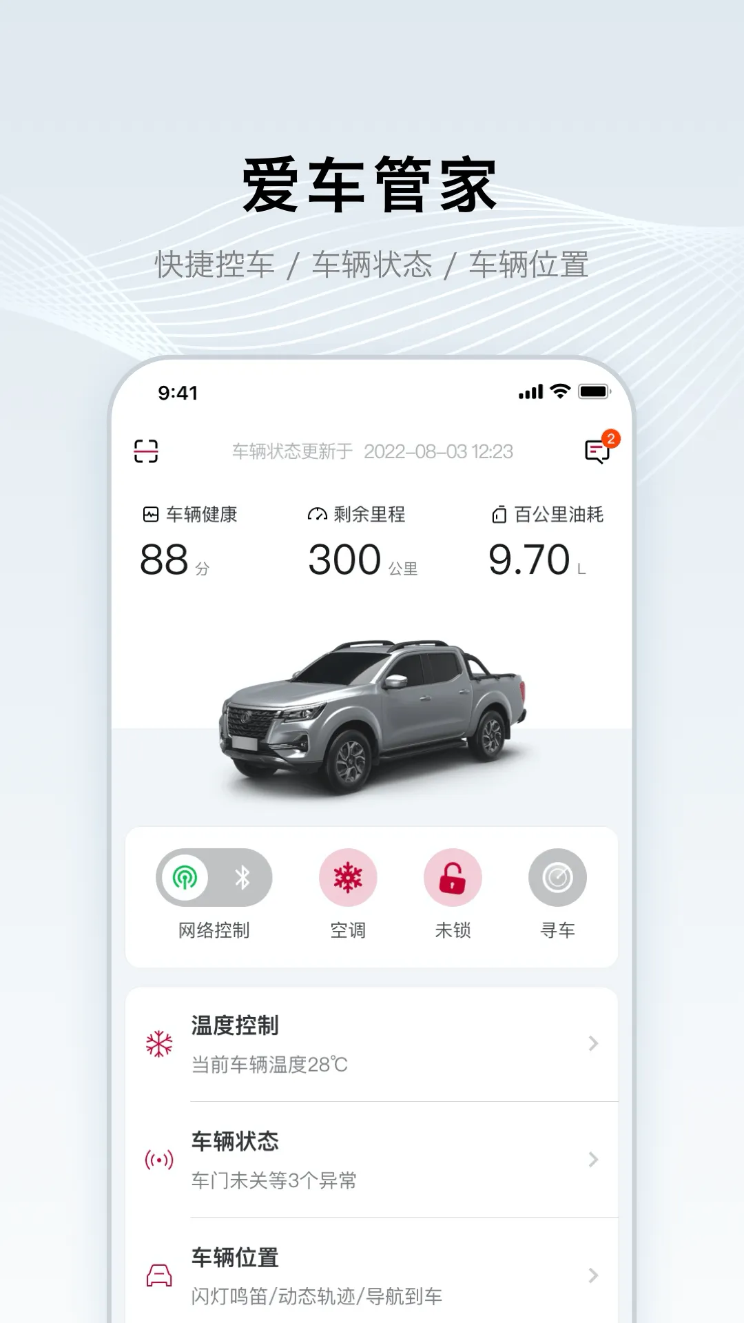 2、功能实用:涵盖智能安防、道路救援、维修保养预约等诸多实用功能,可随时监控爱车状况。