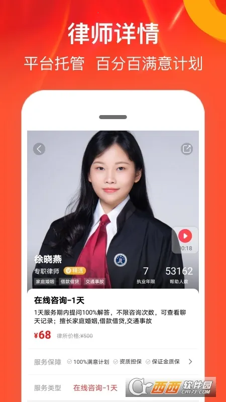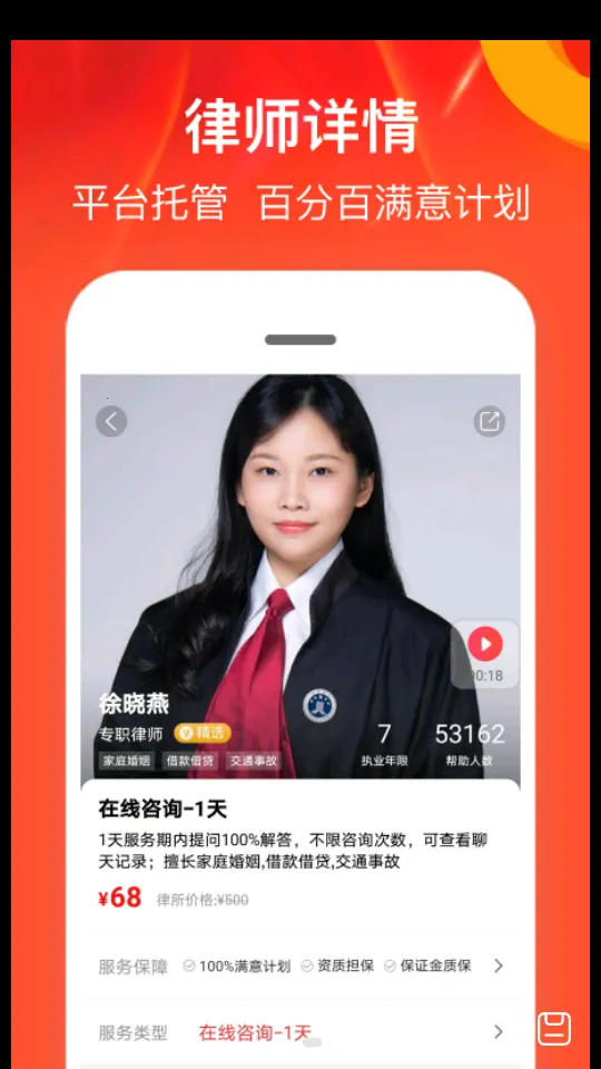 3、交易保障完善,有担保交易,先服务后付款,律师提供不满意退款服务,让用户安心享受服务。