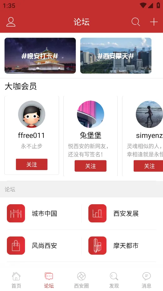 悦西安是聚焦西安的城市论坛APP,由爱西安的人发起。涵盖本地新闻、民生信息,支持论坛式交流。界面以红色为主,触屏设计流畅,还提供生活服务,助用户了解西安、分享生活 。
