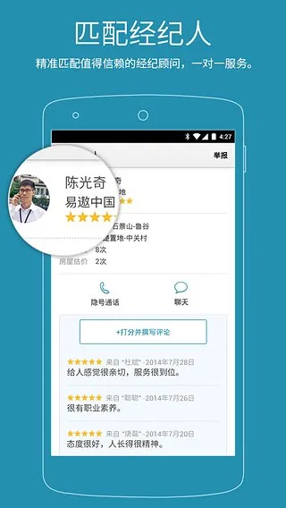 4、保障用户隐私,用户能打电话给经纪人,但经纪人不能打给用户,且经纪人看房需提前预约,带客看房后用户还能打分评价。