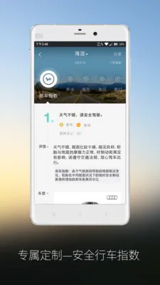 1、为爱车定制专属服务,提供汽车气象指数和最安全及时的行车安全提示,让车主出行更安心。