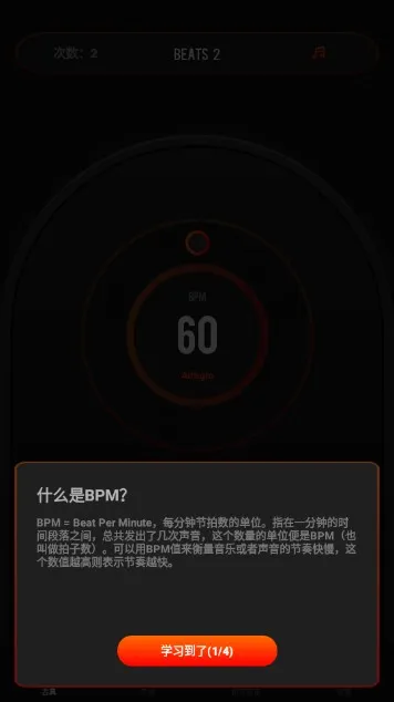 4、功能多样且实用:具备静音、可视化遵循节拍功能,来电时会自动停止播放。还有重音闪光模式,播放中节拍和手机闪光灯明亮呼应,加强视觉感知。提供音乐小知识,帮助用户了解音乐和节拍器,快速入门。