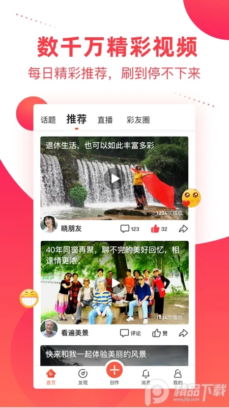 彩视是一款受六千万用户喜爱的视频制作工具,亮点众多。1、素材丰富:内置海量精美素材库和多种分类的短片模板,3D炫酷模板抢先用,各种场景模板每周更新,让作品素材不用愁。2、一键分享:操作简单便捷,可将视频一键分享到微信、微博等平台,还能结识同城同龄好友交流心得。3、社交功能出色:有同龄圈子,是中老年朋友专属直播平台,可一键直播、多人连线互动,还能送缤纷礼物。4、制作功能高级:支持图片、视频、音乐剪辑,有特效滤镜、艺术文字等,让作品与众不同。