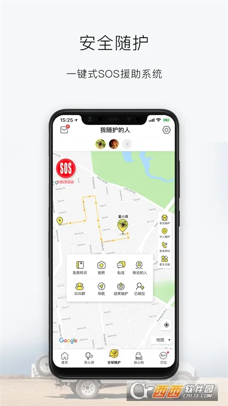 3、强大的安全随护:用户自主发出全球在线随护,紧急时一键SOS求助,可通知紧急联系人或召集附近人提供帮助。
