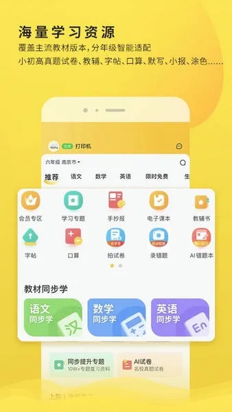 2、海量资源:为小初高学生准备了海量学习资源,覆盖主流教材版本、中高考真题等,分年级智能适配,包含小初高真题试卷、教辅、字帖、口算、默写、小报、涂色等。