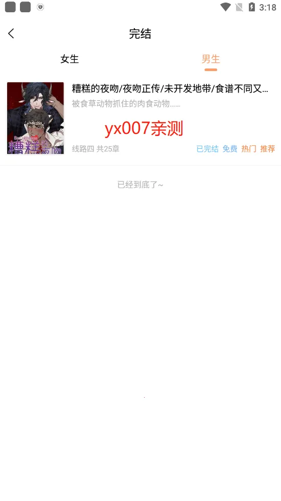 1、题材丰富:涵盖青春、HE、BE、动漫、古代、现代、校园等各类耽美题材,分类齐全,还有超全内容,海量库存,包含几百种不同小说元素,漫画资源也有悬疑恐怖、爱情科幻等多种类型,能满足不同用户的口味和喜好。